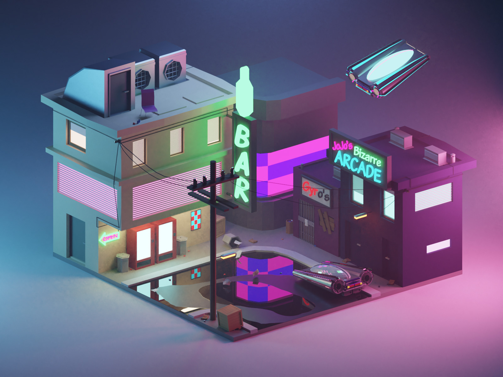 This 3D modeling project depicts a rainy, hazy night in a cyberpunk street corner.